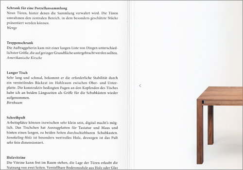 Erläuterungstexte zu den individuell angefertigten Möbeln sind in den Innenklappen des Umschlags gedruckt. Pfeile im Bildteil stellen den Bezug her.